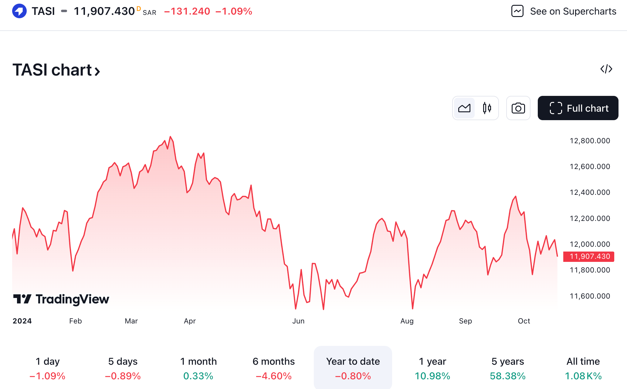 وعلى الرغم من الأداء القوي لمؤشر تاسي في شهر سبتمبر حيث أغلق المؤشر عن 12,226.100 نقطة. إلا أننا حاليا نواجه هبوط بمقدار -0.8% منذ بداية عام 2024.
