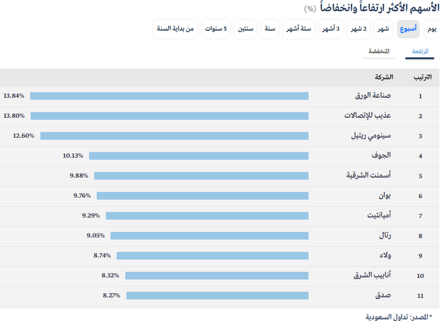 حيث سجلت “صناعة الورق“ و"اتحاد عذيب للاتصالات" ارتفاعًا كبيرًا، وكذلك أسهم "سينومي ريتيل" و”الجوف الزراعية”.