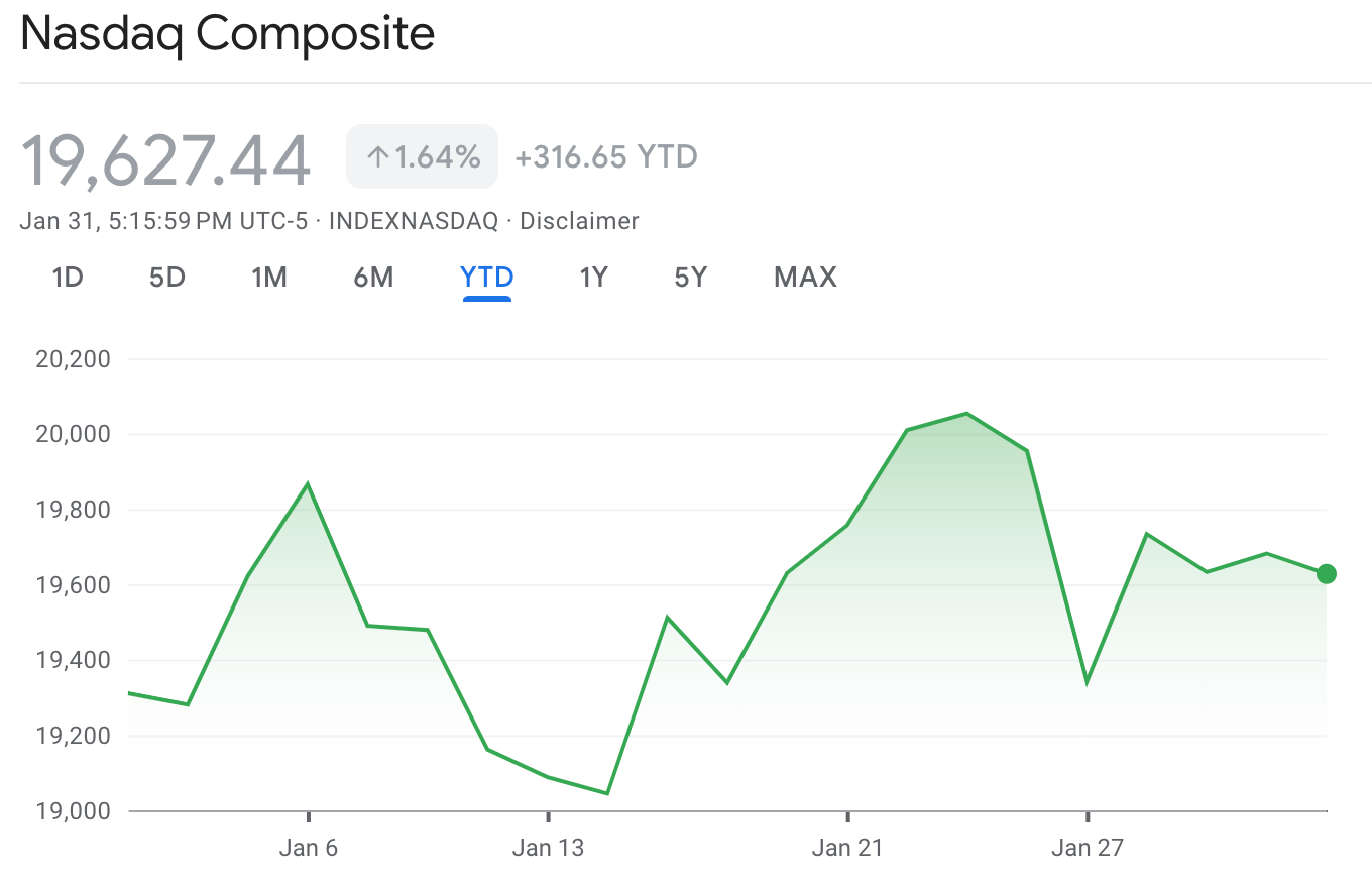 كان مؤشر ناسداك أقل حظا بسبب التعرض الكبير لشركات التقنية والتي كانت المتضرر الأكبر من أحداث DeepSeek. حيث ارتفع فقط بمقدار 1.6% ليغلق على 19627 نقطة.