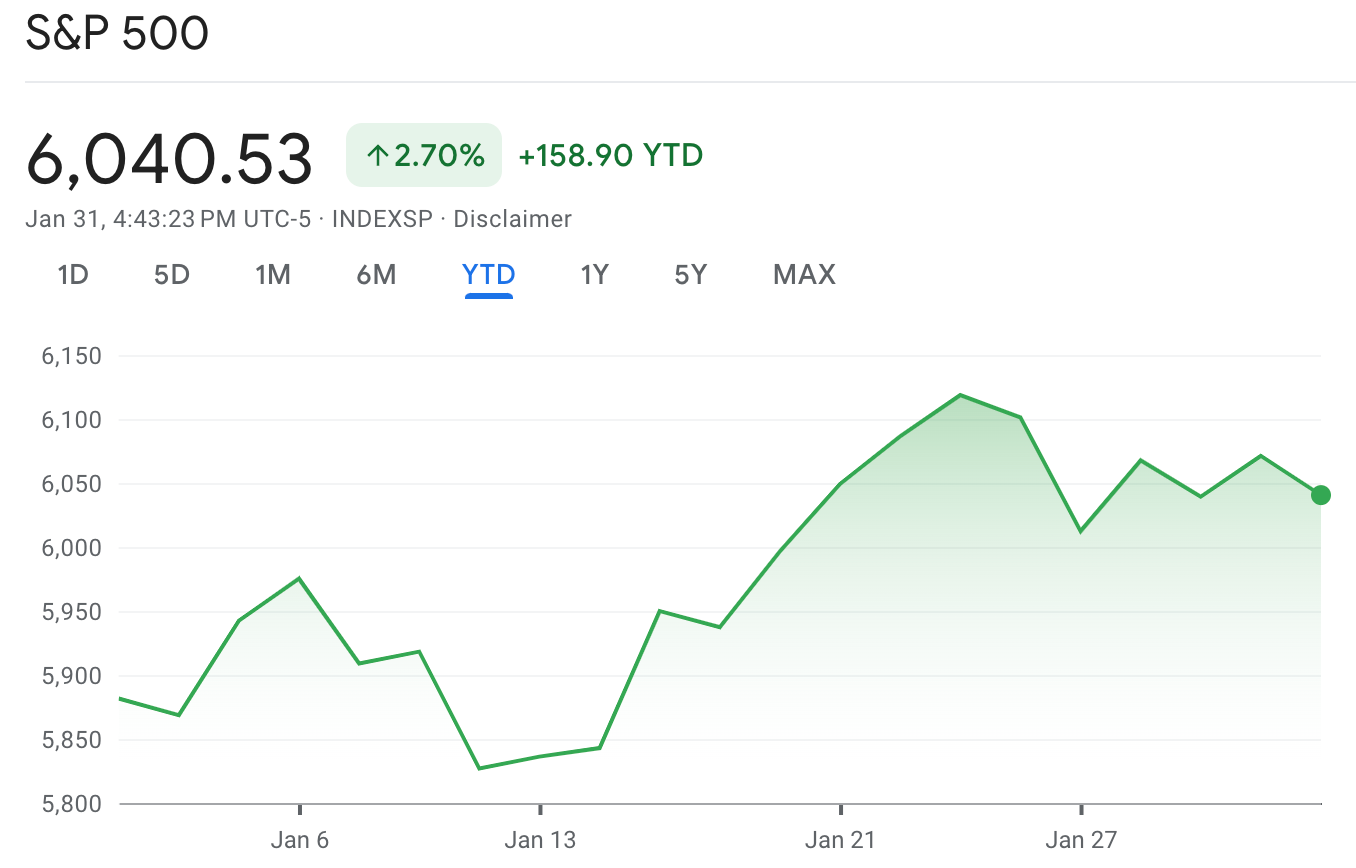 على الرغم من الهبوط العنيف يوم ظهور شركة DeepSeek على الساحة، فقد استطاع مؤشر S&P500 أن يحقق ارتفاع بمقدار 2.7% ويغلق عن 6040 نقطة في آخر تداولات شهر يناير 2025.