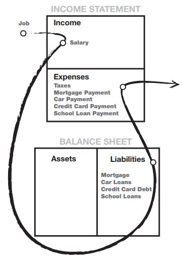 هذا الشكل يشرح لنا كيفية تفكير الفقراء في إدارة أموالهم، فإنهم ينفقون كل دخلهم بصورة مستمرة، وكلما زاد الدخل رفعوا من مستواهم المعيشي بدلا من شراء الأصول. فيظل الفرد صاحب هذه العقلية يعمل طوال حياته من أجل المال في متاهة سباق الفئران، دون أن يتوفر له اي أصل يجعل المال يعمل من أجله، يدر عليه أي دخل إضافي.