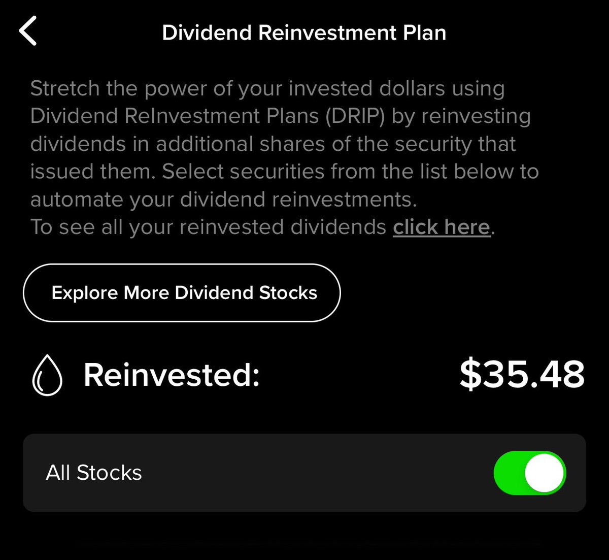 هذه الخاصية تساعدك في إعادة ضخ توزيعات الأرباح في نفس السهم مرة أخرى، بحيث يكون التوزيع المقبل أكبر من التوزيع السابق. وهو حجر الأساس في بناء كرة الثلج لثروتك
